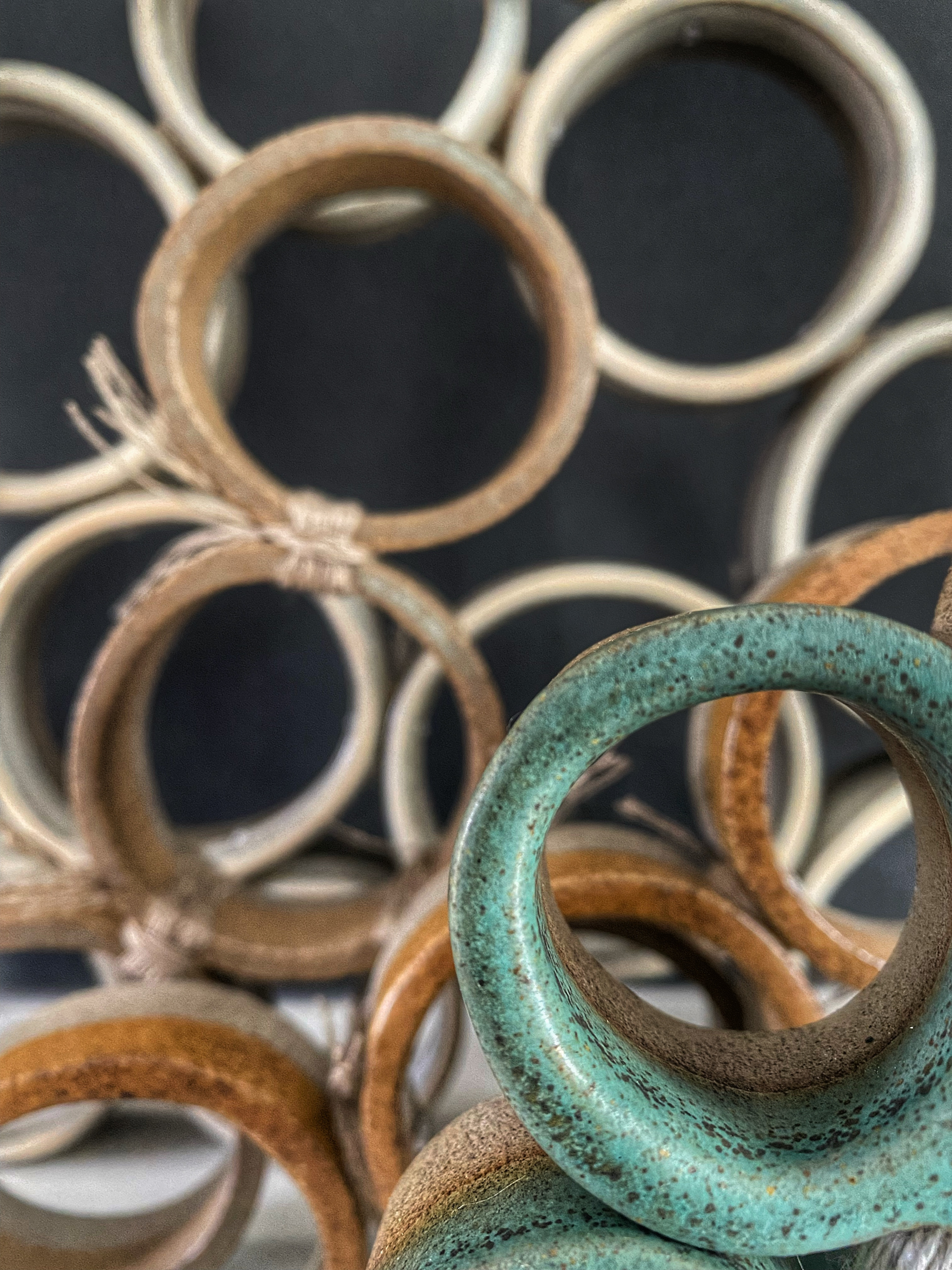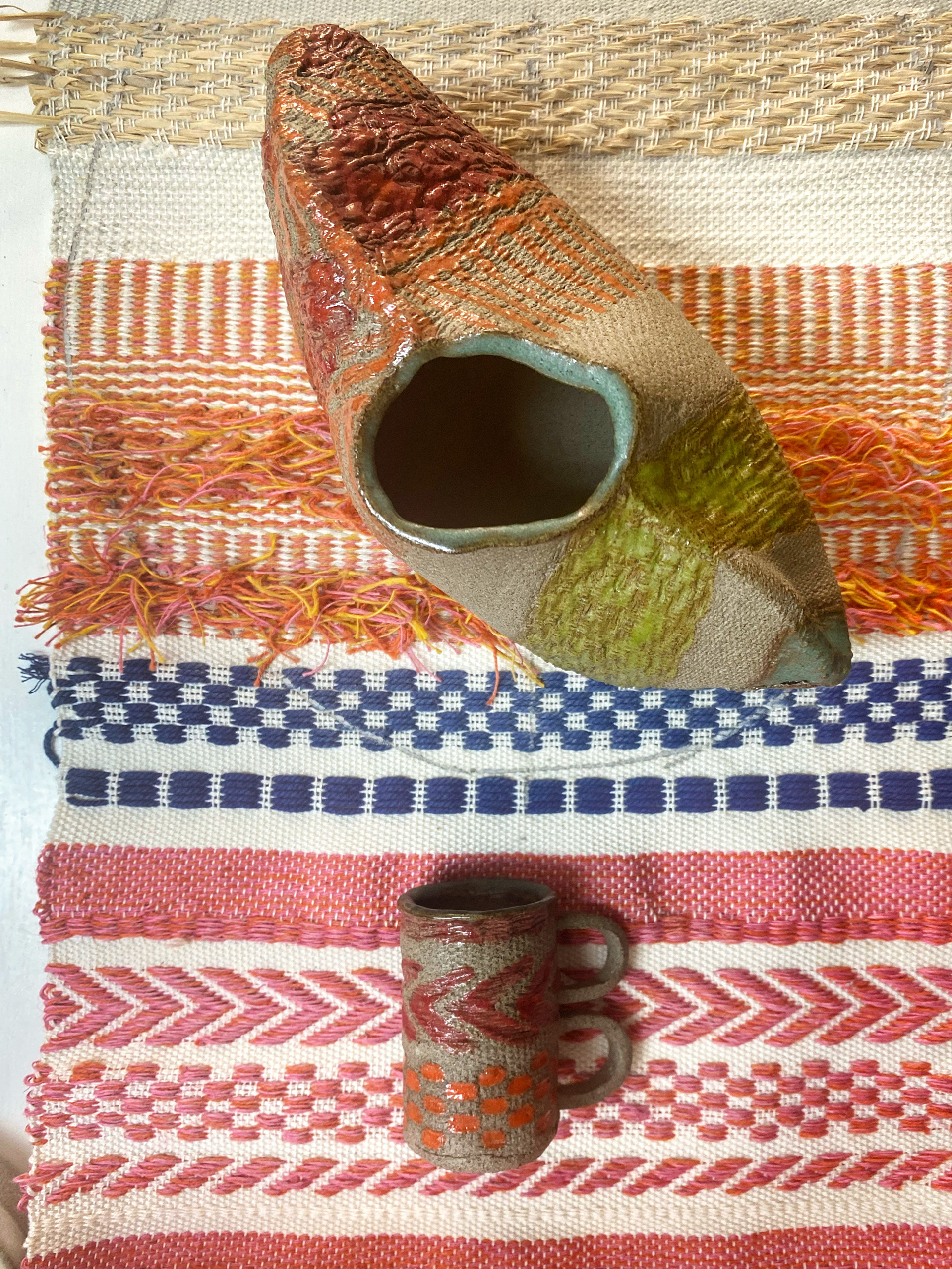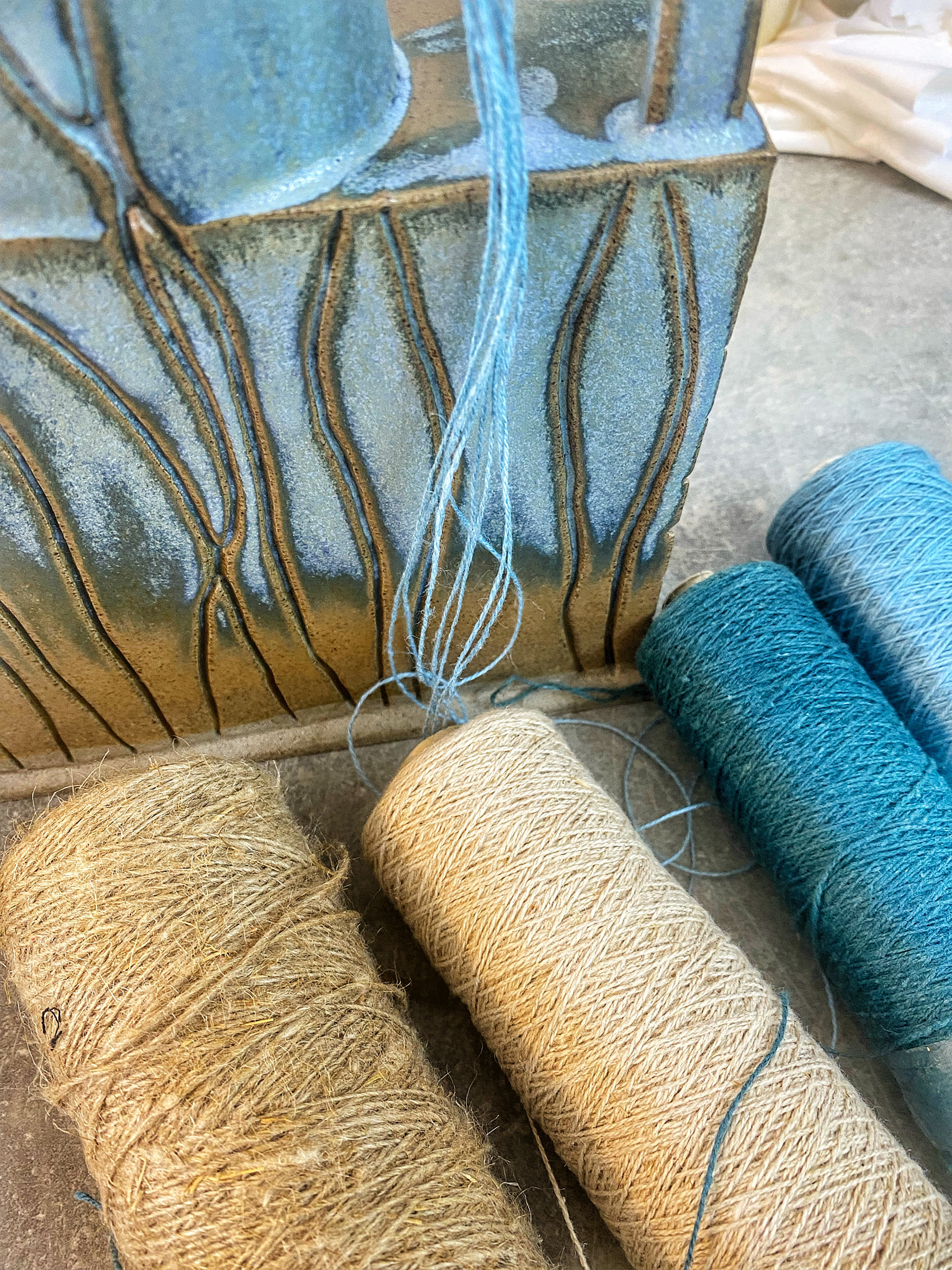 Del av utställning. Stengods och lin. KKV Textiltryck Malmö. Foto Southern Sweden Design Days.