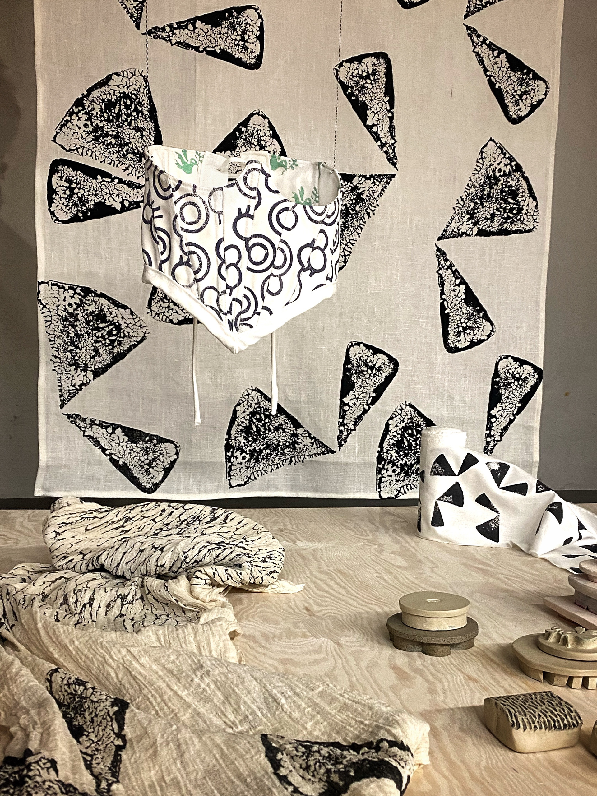 Del av utställning med avtryck från keramik på bomull. Pigmentfärg. KKV Textiltryck Malmö.